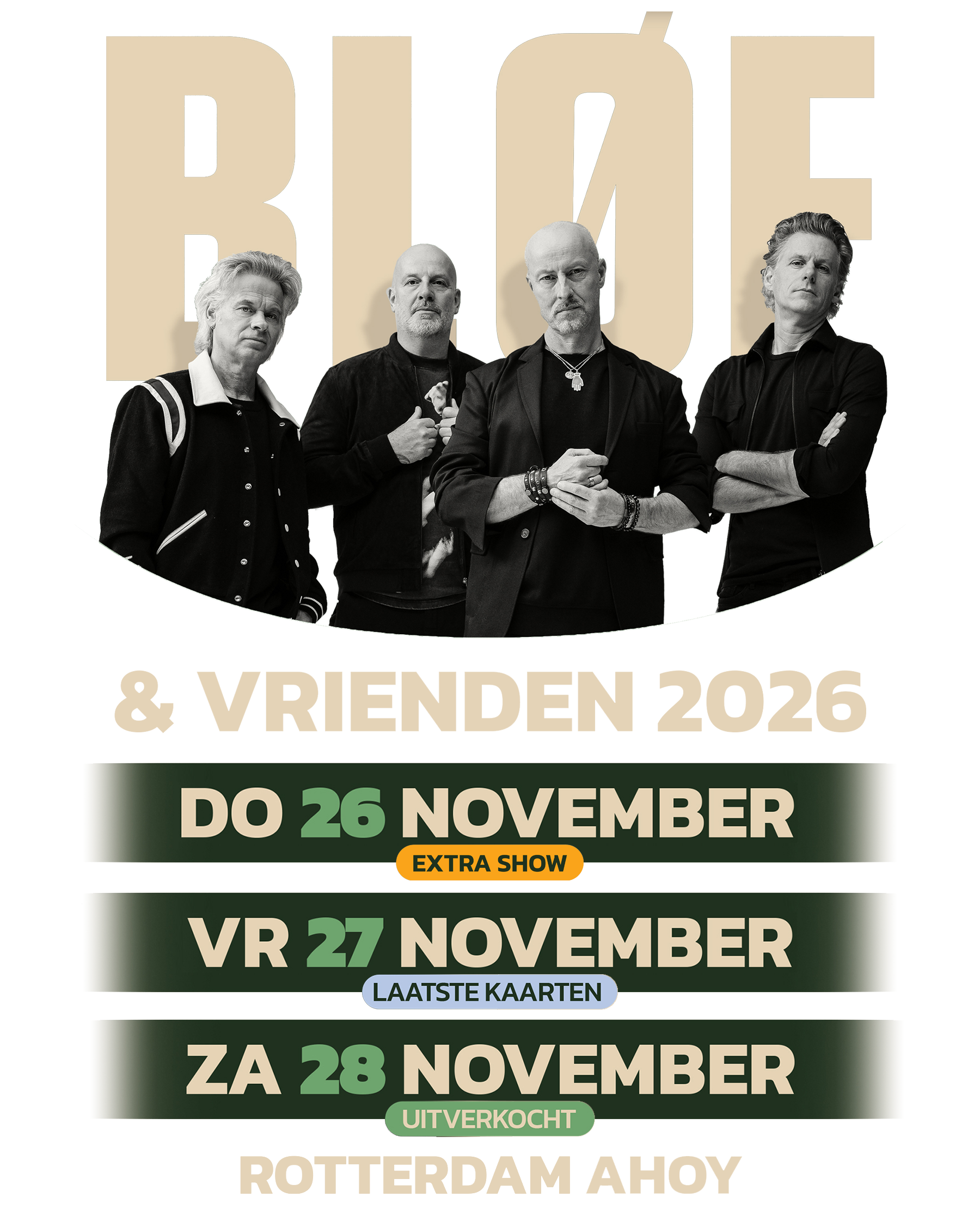 BLØF geeft op 26, 27 en 28 november 2026 wederom grote ‘BLØF & Vrienden’ concerten in Rotterdam Ahoy. De band speelt hun grootste hits, bijgestaan door een verzameling muzikale vrienden.